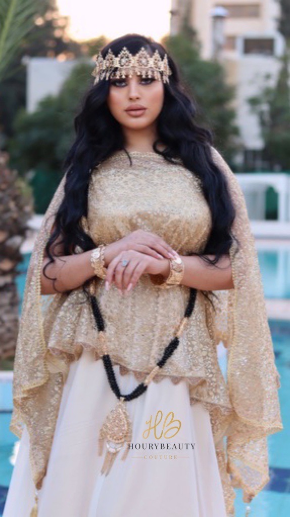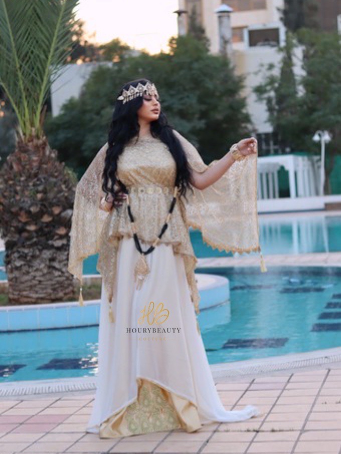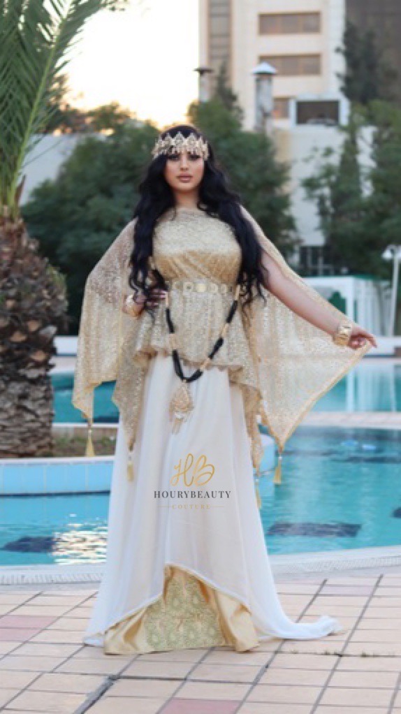 Robe chaouia ” CLÉOPÂTRE ” confectionnée avec de la soie avec robe satiné blanche en dessous. Cette robe est composée de trois pièces.