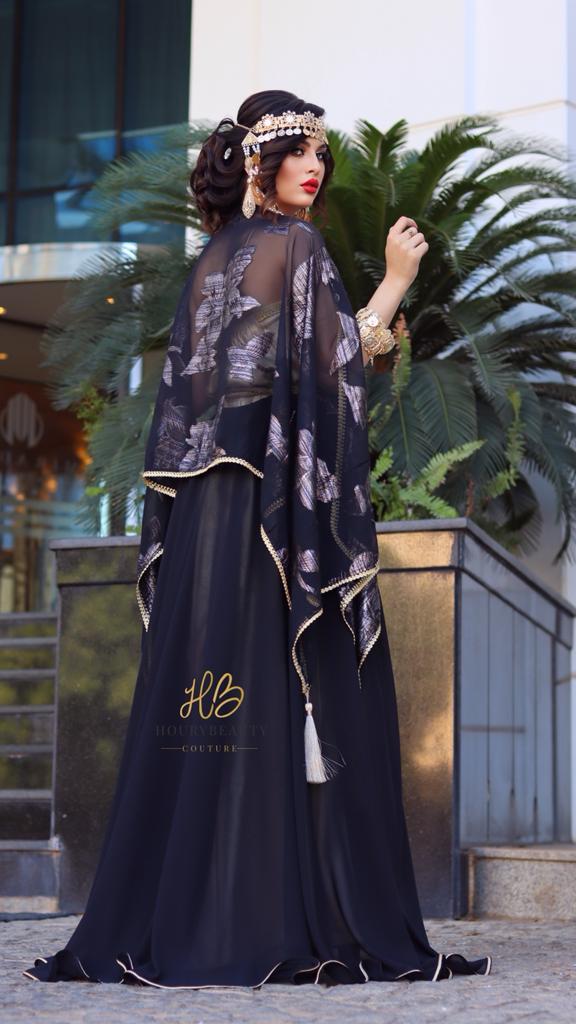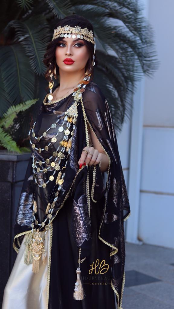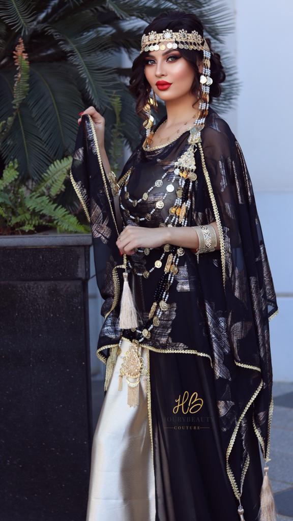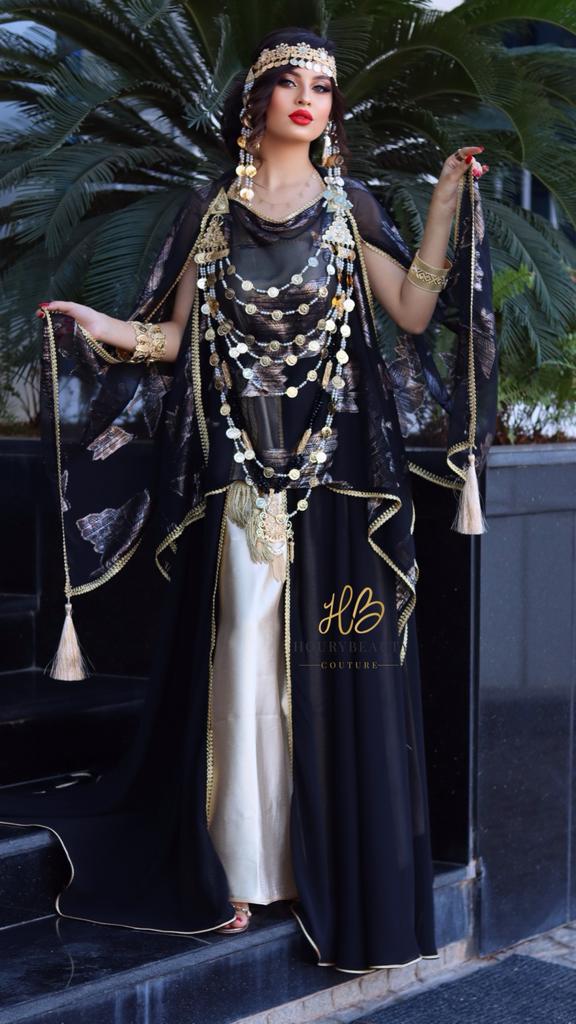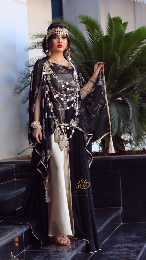 Confectionnée avec de la mousseline imprimée et robe bustier en satin doré.disponible en confection sur mesure délai 8 semaines.