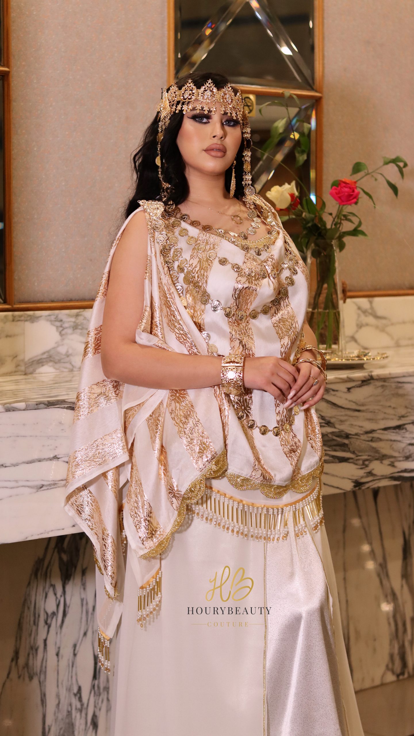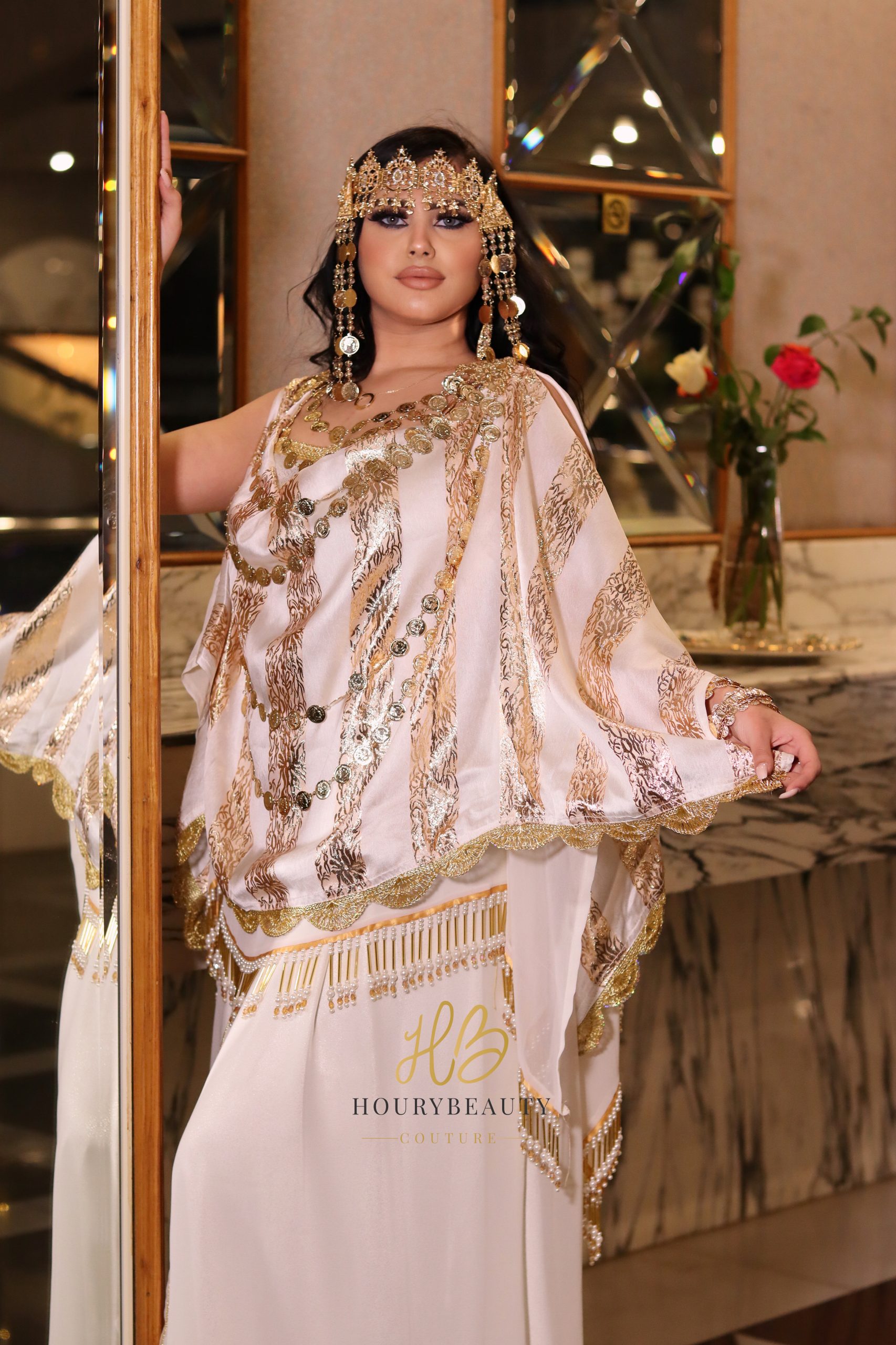 Robe chaouia, confectionnée avec du satin, de la soie de jouhara accessoirisé de perles et de la mousseline.
