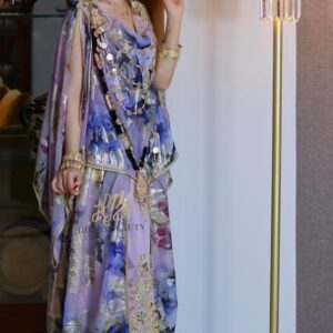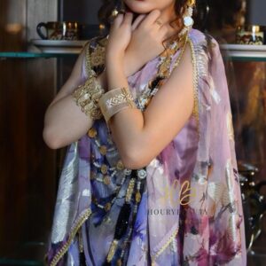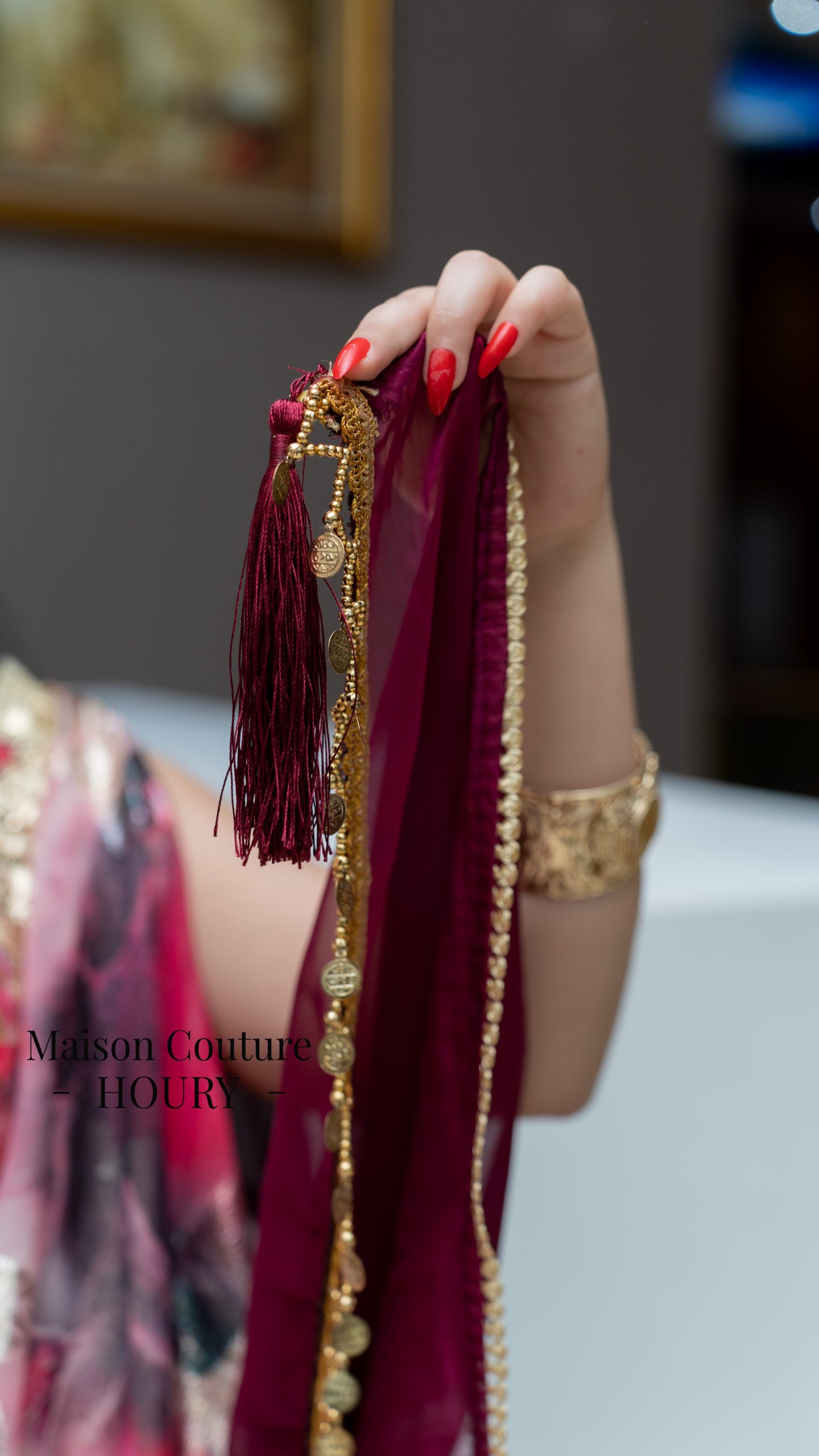 Le bustier doré ajusté prés du corps, sublime la silhouette avec une touche éclatante . Il est délicatement superposé d’un tissu en mousseline à fleurs, apportant légèreté et fluidité à ensemble. Des galons finement travaillés soulignent chaque détail, ajoutant une note d’authenticité et de sophistication.
