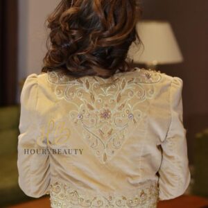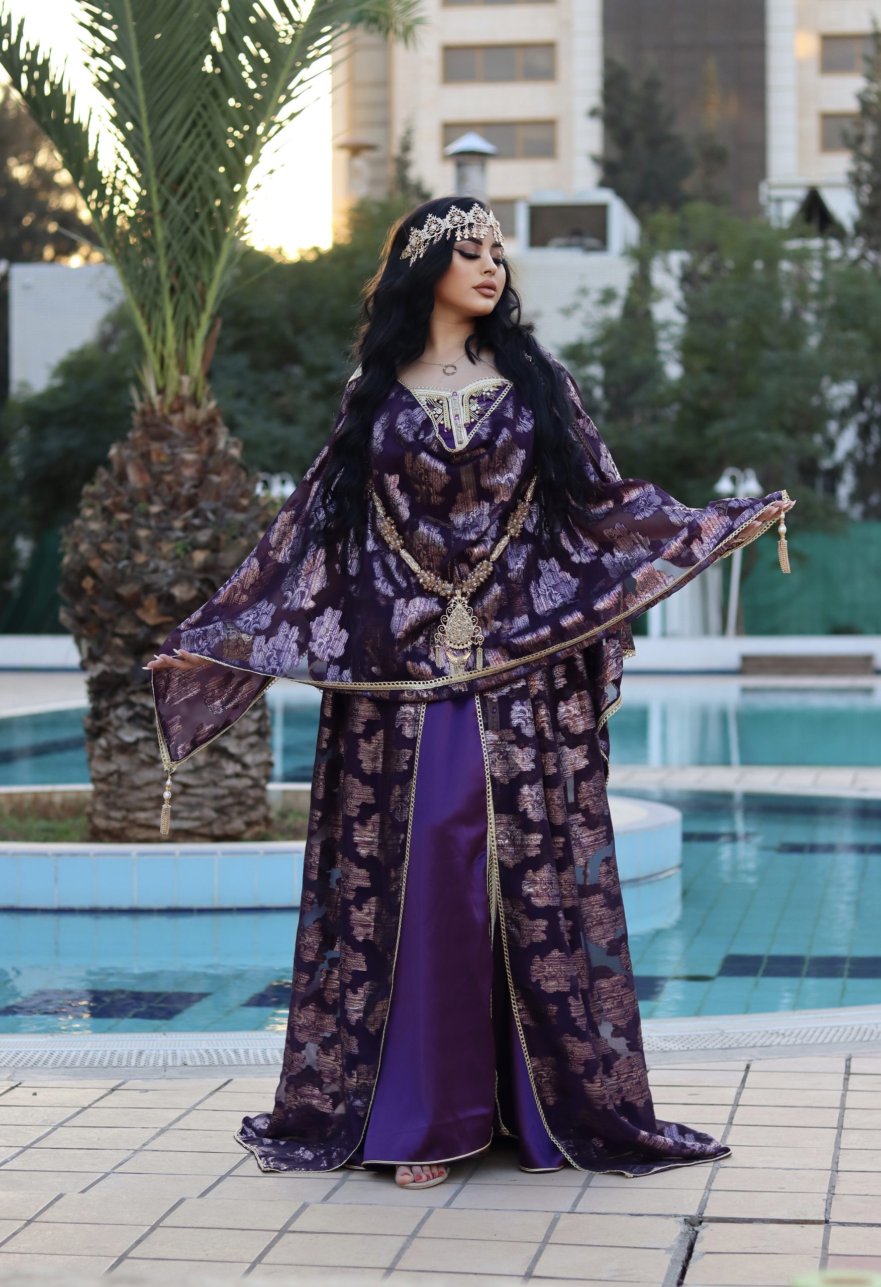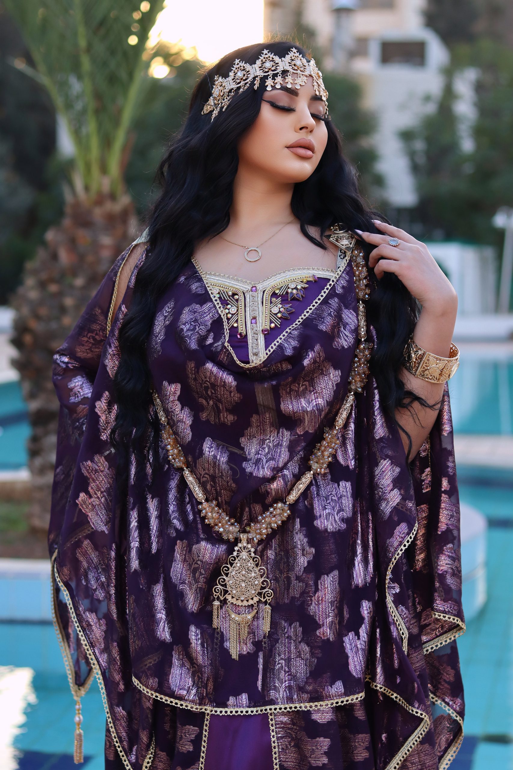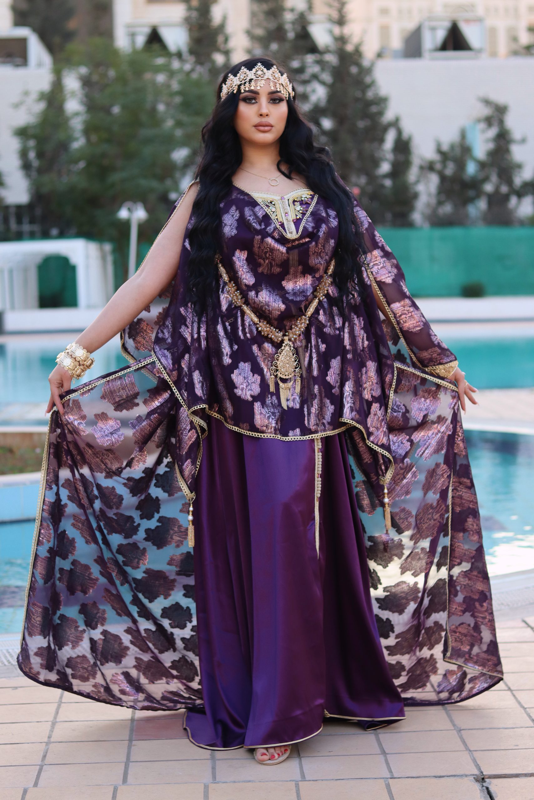 Robe chaouia confectionnée avec de la mousseline de soie imprimée et du satin ornée de cristaux.
