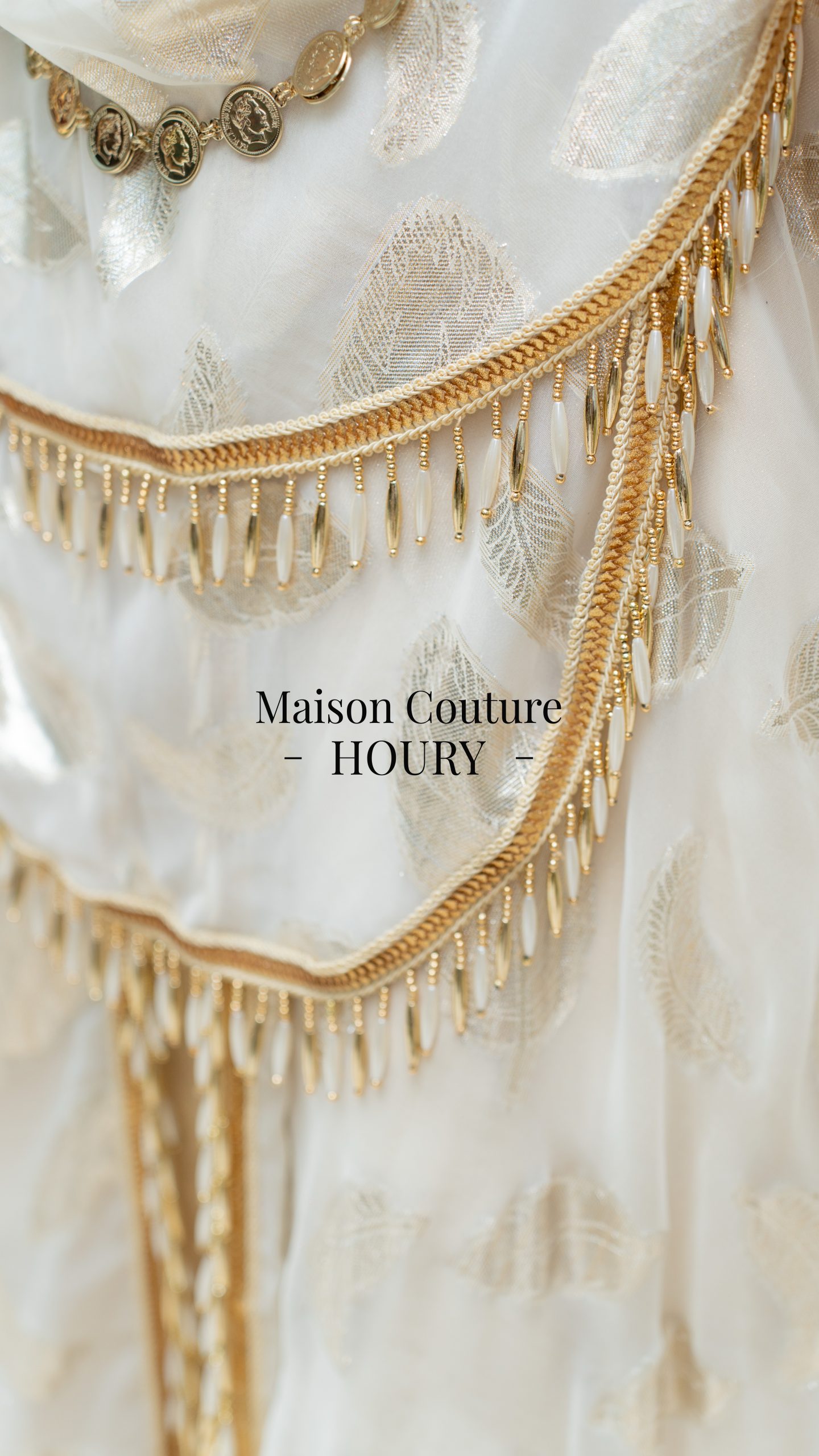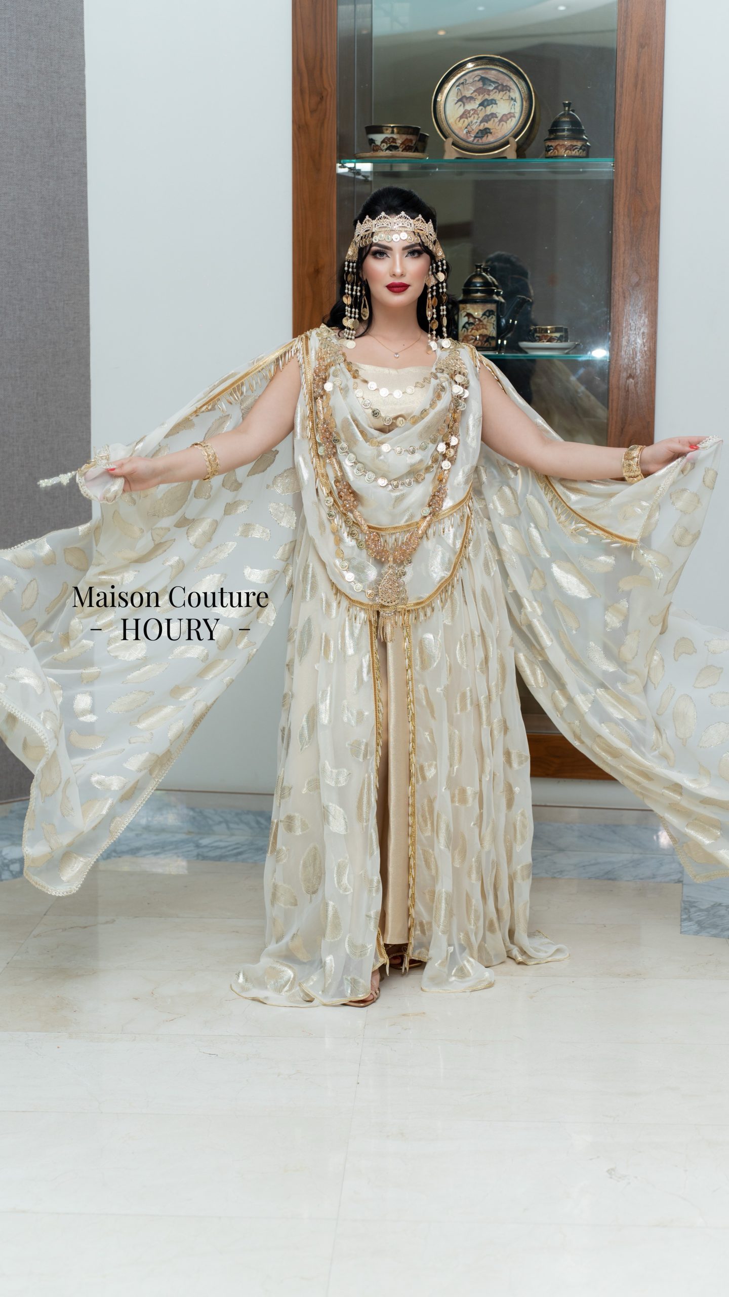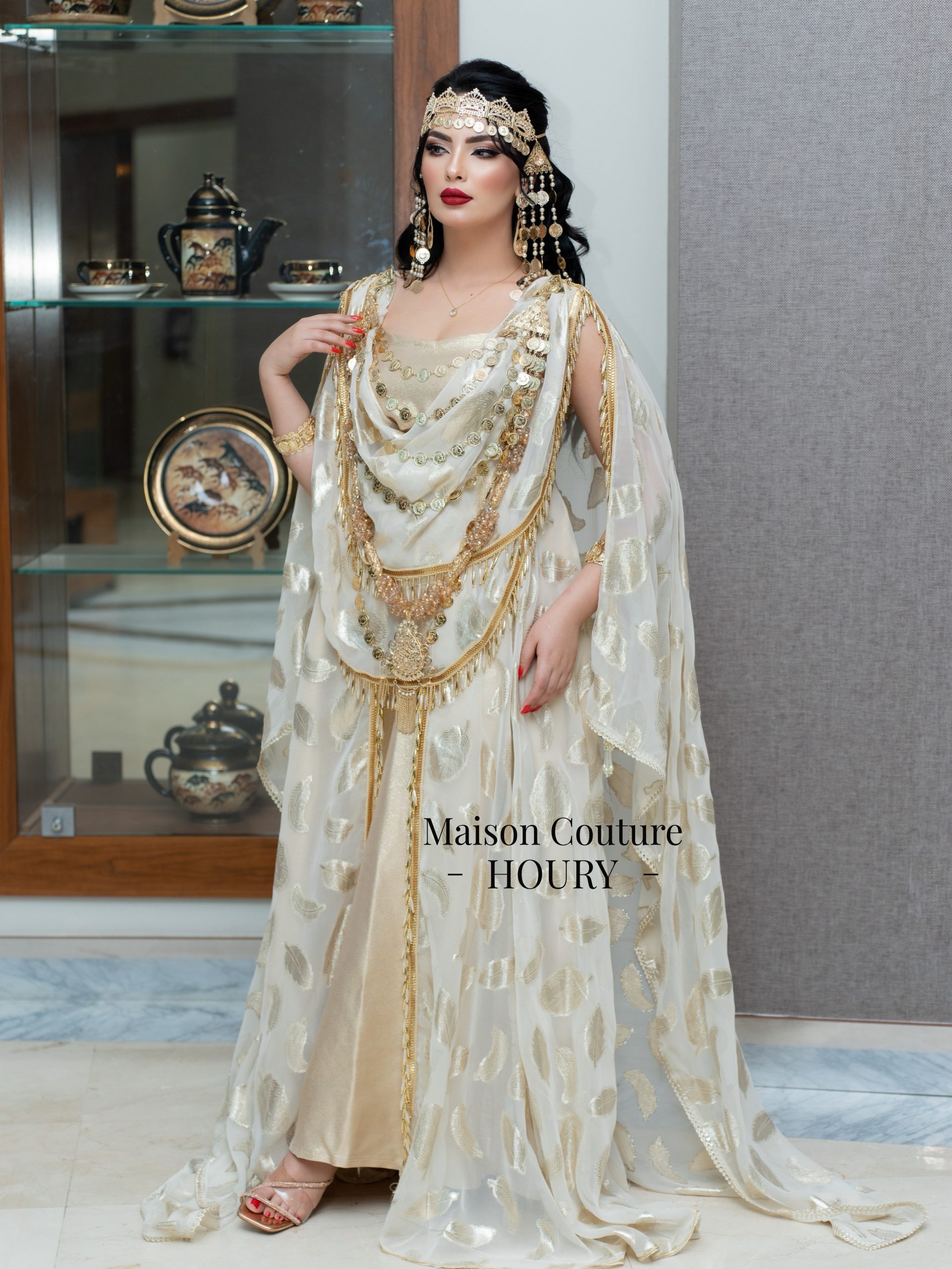 Robe chaouia SUBLIME Confectionnée avec de la mousseline de soie imprimée en dessous une robe en satin duchesse or avec des galons or