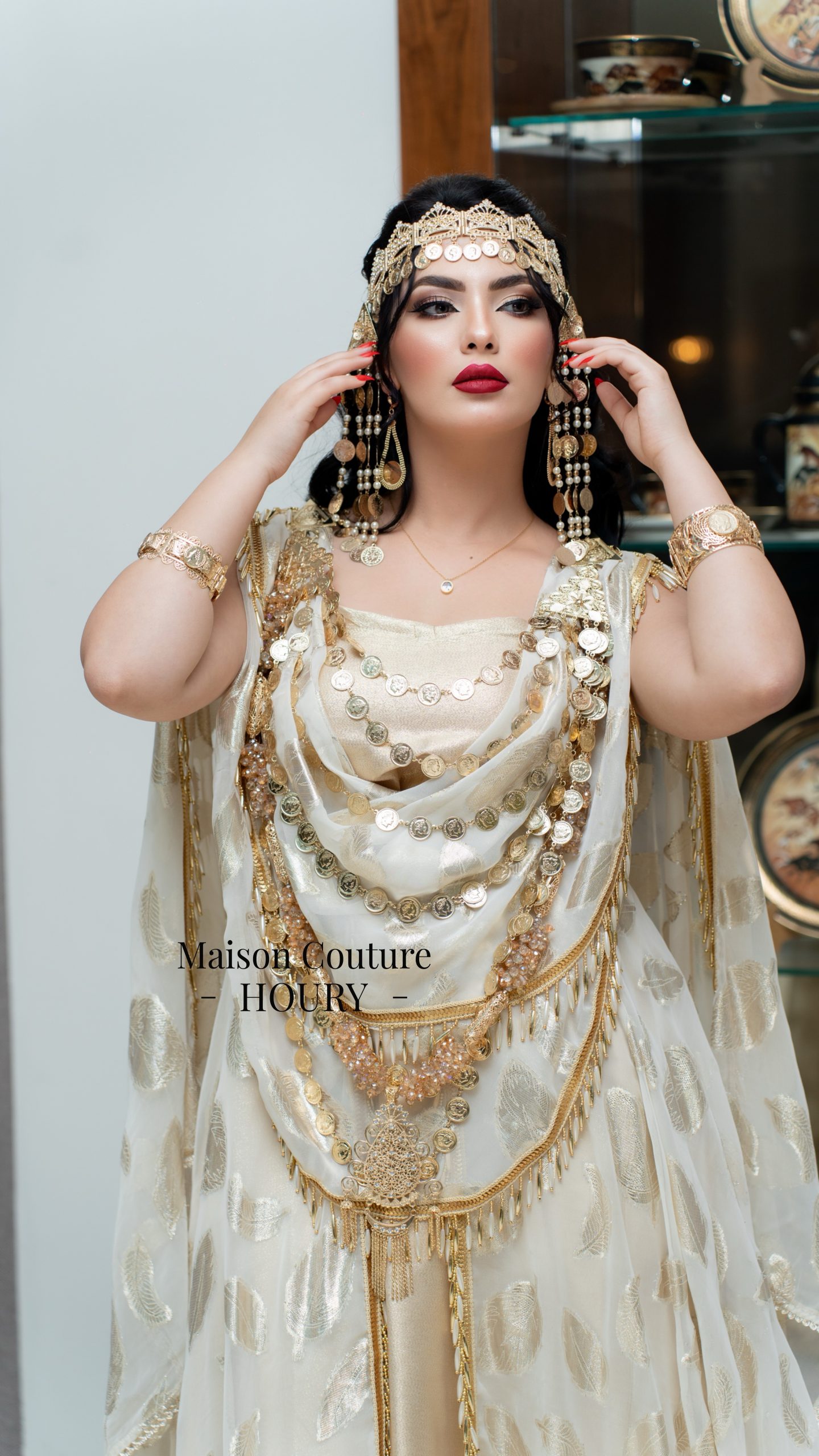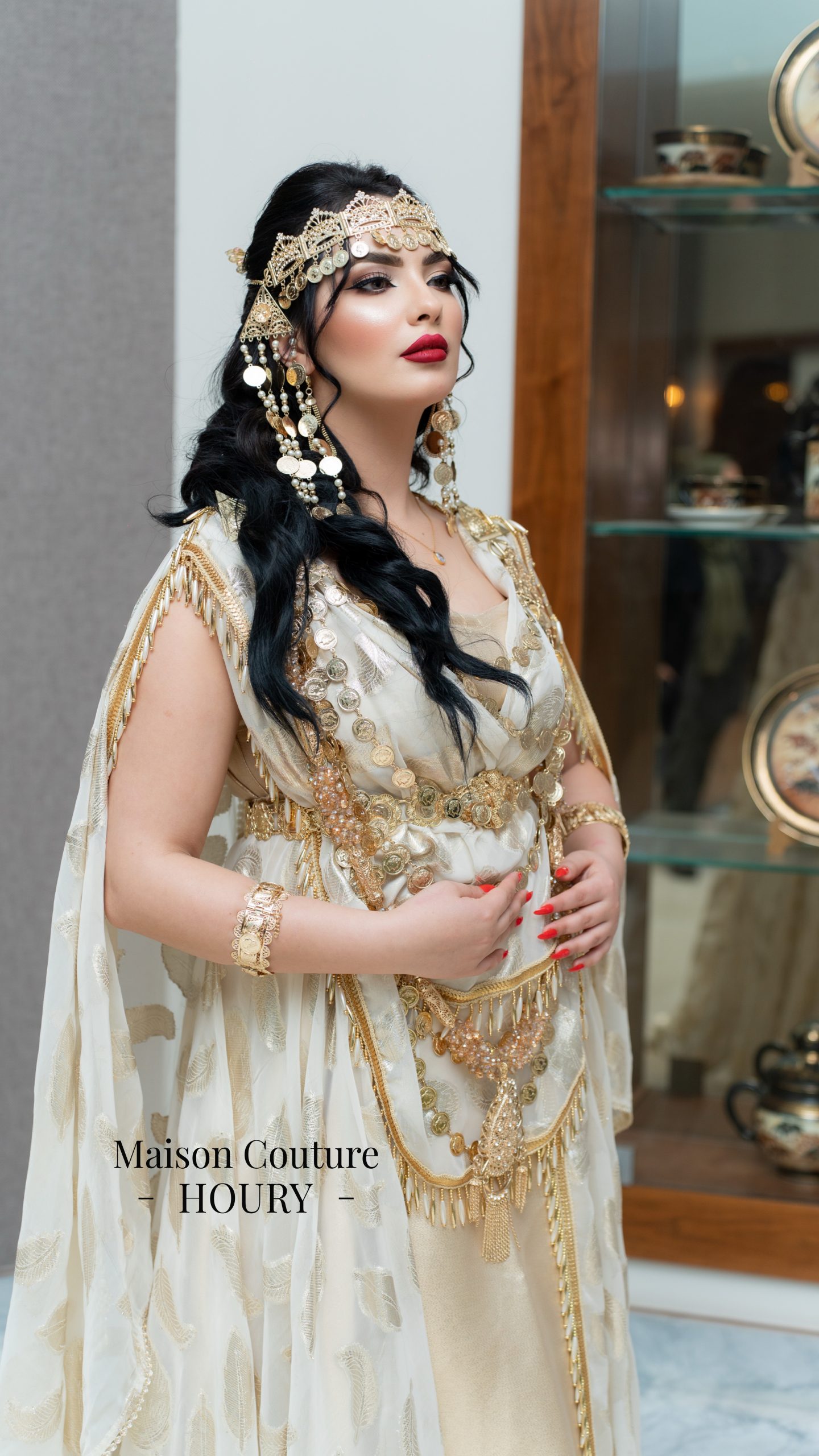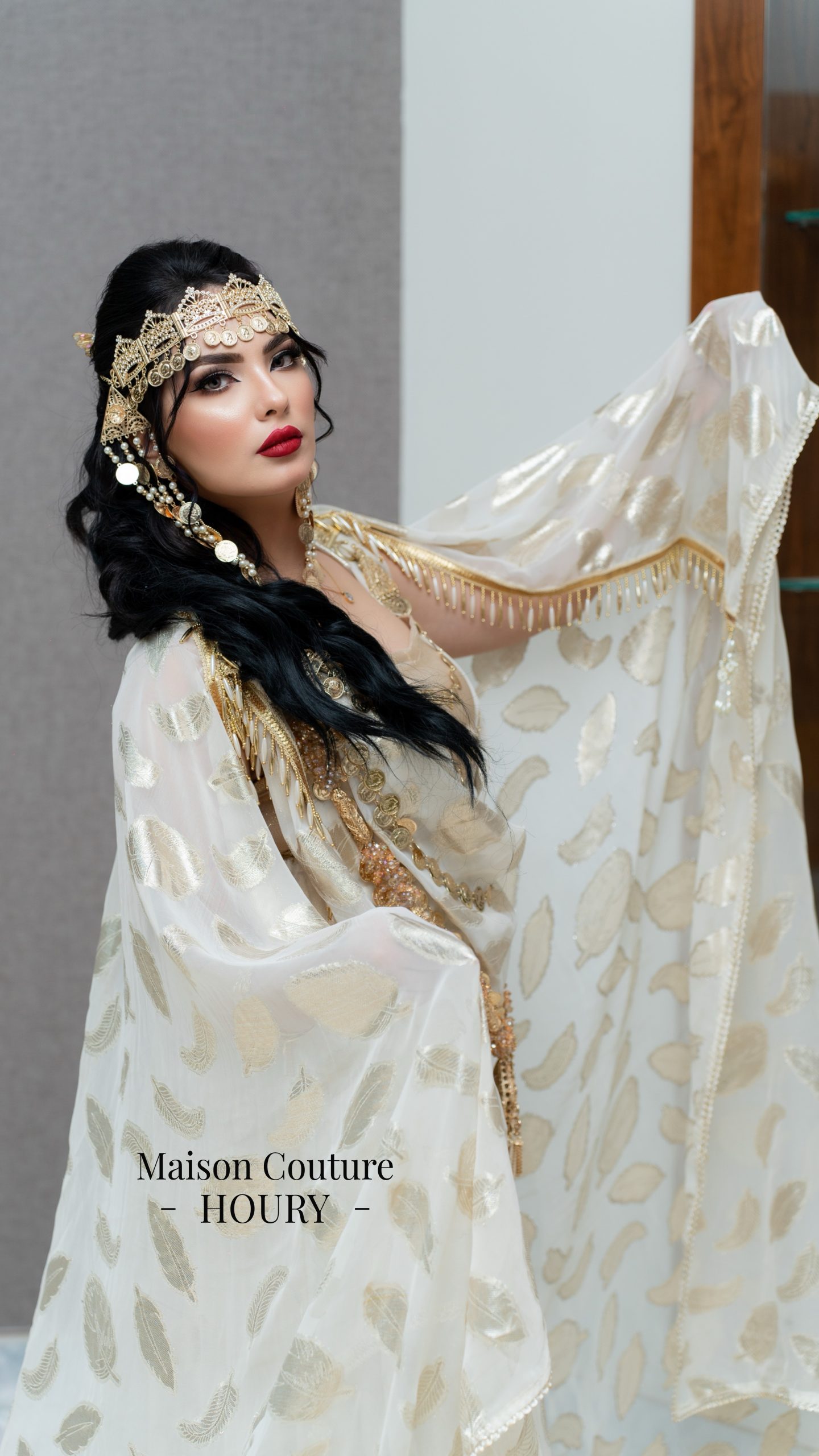 Robe chaouia SUBLIME Confectionnée avec de la mousseline de soie imprimée en dessous une robe en satin duchesse or avec des galons or