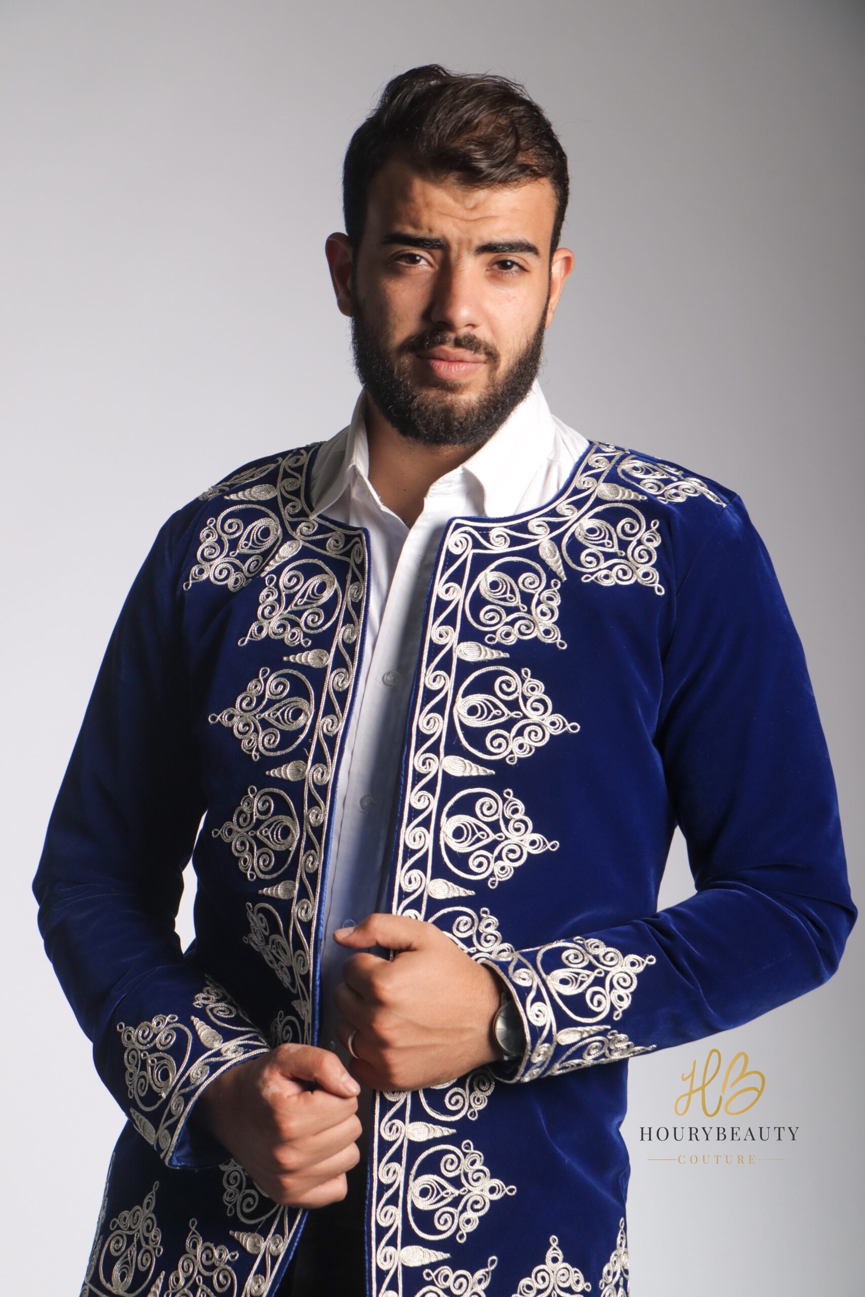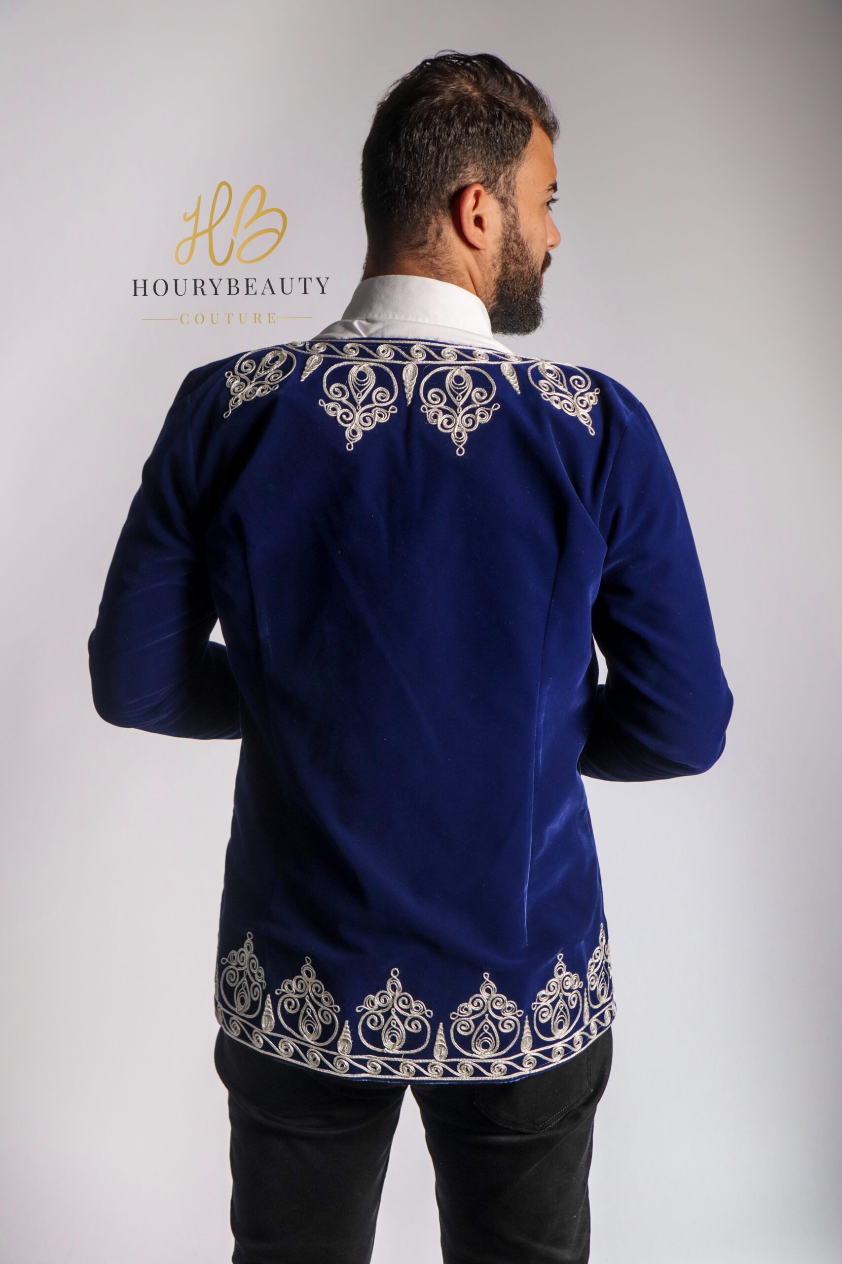 Veste homme conçue en velours bleu roi avec fetla hora de couleur argent entièrement faite à la main. Taille 42 Confection sur mesure sous un délai de 1 mois (livraison dans toute la France comprise)
